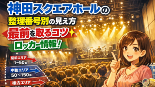 この記事は、神田スクエアホールでライブやイベントに参加する予定があり、整理番号ごとの見え方や最前を狙うコツ、ロッカー事情を事前に把握しておきたい人に向けたガイドです。